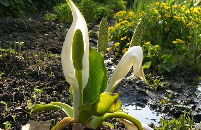 Eine besonders interessante Pflanze am Teichrand ist die Weiße Scheinkalla (Lysichiton camtschatcensis). Es gibt sie auch in gelb.