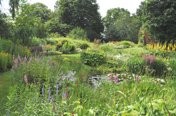 Weißes und Rotes Mädesüß (Filipendula rubra und F. purpurea) und die Gelbe Wiesenraute (Thalictrum flavum) überschäumen die feuchte Wiese im Juni und Juli. Leider wird das gefüllte weiße Mädesüß oft von Mehltau befallen, und die Blüten gehen nicht richtig auf.