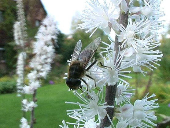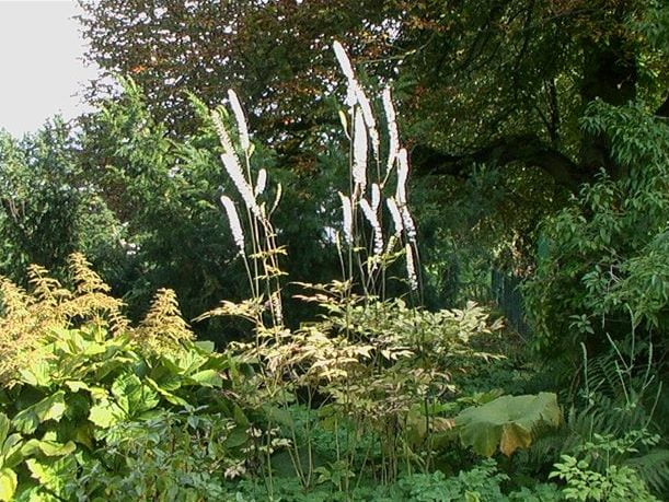 Cimicifuga ramosa, die Septembersilberkerze kommt aus Kamtschatka und blüht im September, wie der Name sagt. Wenn das Laub schon zu vergilben beginnt strecken sich die weißen Blütenkerzen bis 2 m hoch.