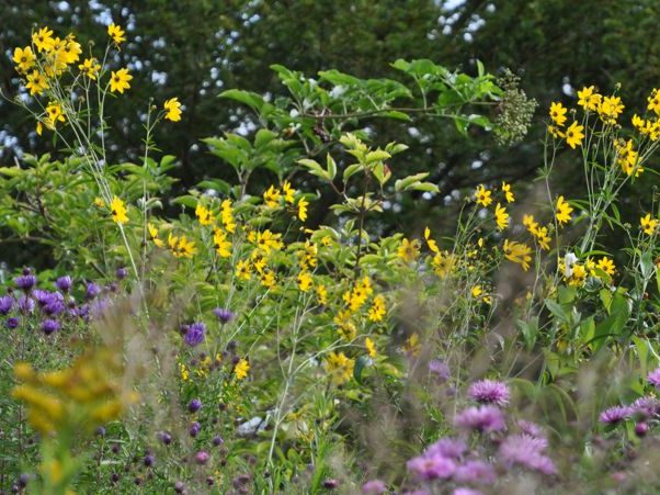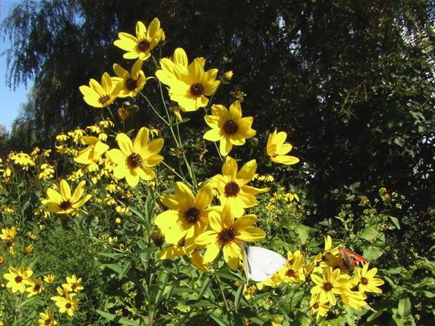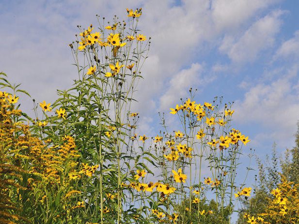 Coreopsis tripteris, das Hohe Mädchenauge, ist tatsächlich über mannshoch und kommt aus den USA. Es blüht noch spät im Herbst und leistet den bunten Herbstastern Gesellschaft. Bei Trockenheit wird es nur halb so groß.