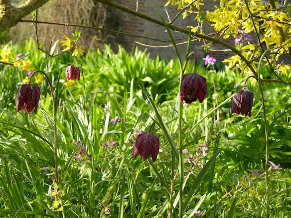 Frittilaria meleagris, die Schachbrettblume kommt ursprünglich aus Südeuropa ist aber in Deutschland als eingebürgert anzusehen. Die Zwiebelblume wächst im Schatten der Sträucher und versamt sich auch. Sie blüht im April.