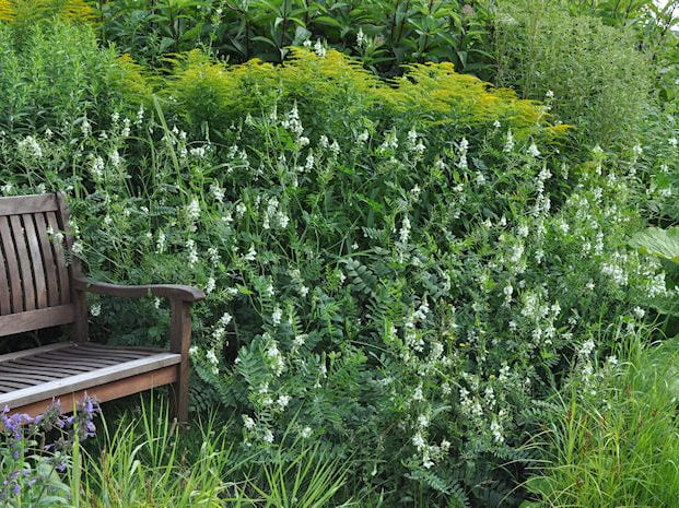 Galega x hartlandii, die brusthohe Geißraute kommt aus Südost-Europa und ist gelegentlich auch in Deutschland verwildert anzutreffen, da sie früher als Heil- und Futterpflanze genutzt wurde. Sie blüht im Juni/Juli. Sie wächst auf sonnigen Standorten mit lehmigem, nährstoffreichem Boden bei immer ausreichender Feuchtigkeit am besten. Auf trockenem und halbschattigem Standort wird sie nur halb so hoch.