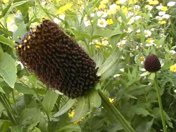 Rudbeckia occidentalis, der Westliche Sonnenhut ist in kaum einem Staudenbuch zu finden. Dieser Sonnenhut ist aber auch eigenartig, ihm fehlen die gelben Blütenblätter. Er blüht im August.