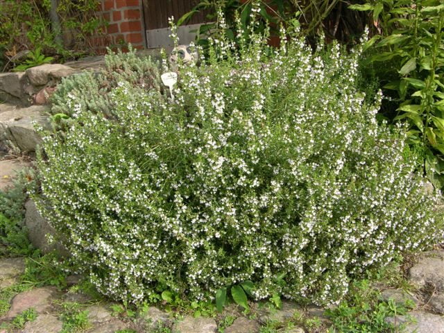 Satureja montana, das Bergbohnenkraut, ist eigentlich ein Gewürz aber auch als Polsterstaude ansehnlich. Es wächst bei mir seit mehr als 10 Jahren gleich neben der Haustür in einer Steinfuge. Es blüht im August.