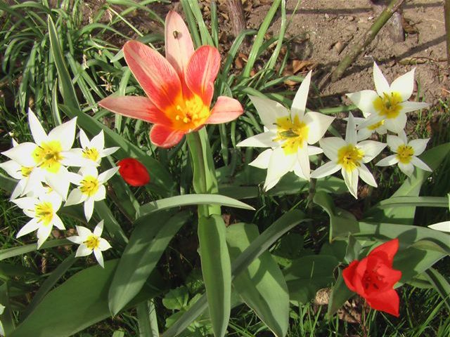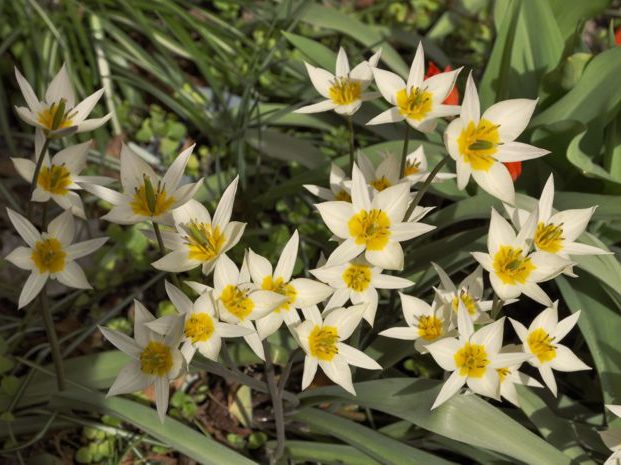 Tulipa turkestanica, aus Turkestan blüht weiß mit gelber Mitte schon sehr früh im April, zusammen mit frühen Osterglocken, T. kaufmannia und praestans. Sie sieht mit den schmalen Blättern und kleinen Blüten sehr „wild“ aus.